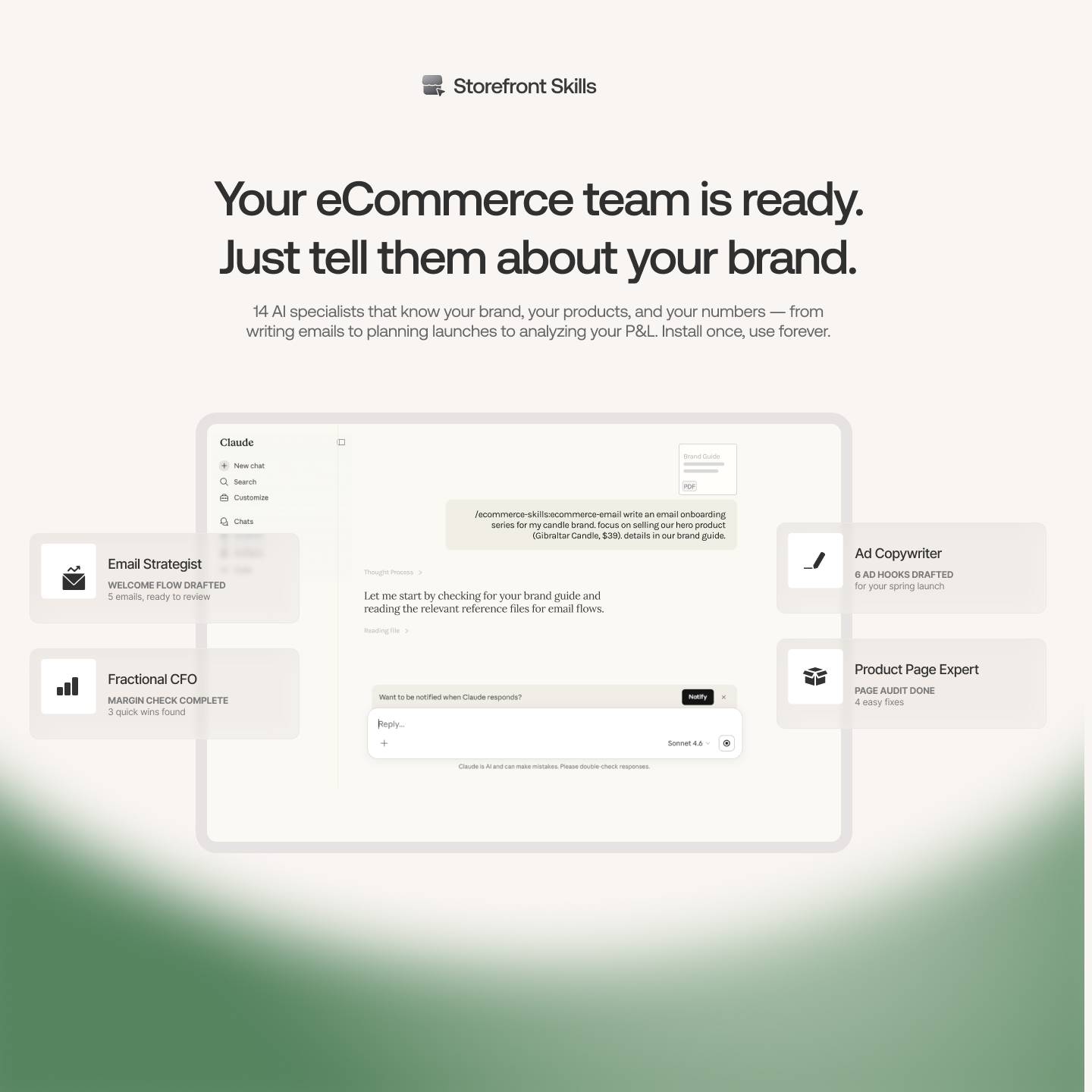 14 Claude Skills crafted for eCommerce founders and operators. Write emails that convert, plan product launches, analyze your margins, and spy on competitors — all with your brand's context. Works inside Claude AI.